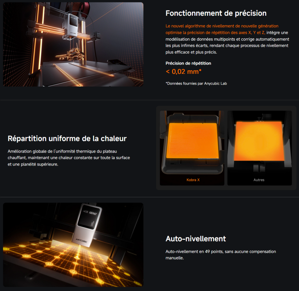 L’Anycubic Kobra X intègre le système LeviQ 3.0, un auto-nivellement avancé basé sur une mesure en 49 points du plateau.