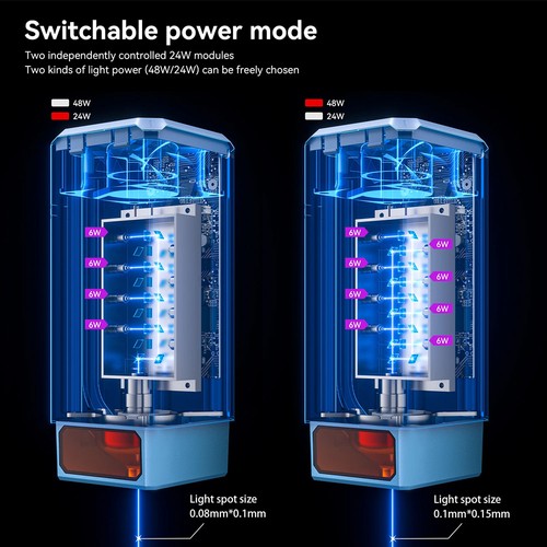 Passez facilement de la découpe haute puissance de 48 W à la gravure de précision de 24 W. Utilisez la puissance de 48 W pour une découpe performante et celle de 24 W pour une gravure d’une extrême finesse : une seule machine, deux fonctionnalités.