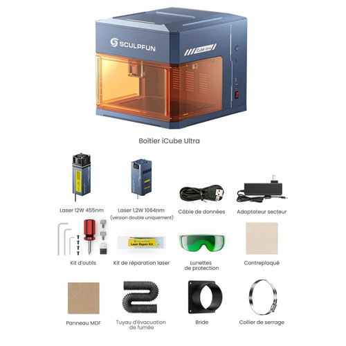 | Contenu du colis | 1 x corps de machine iCube Ultra 1 x laser bleu 12 W 1 x câble de données 1 x adaptateur secteur 1 x Ensemble d’outils 1 x kit de réparation d’objectif 1 x lunettes 1 x planche de bois 1 x MDF 1 x tuyau d’échappement 1 x bride 1 x collier de serrage  |
